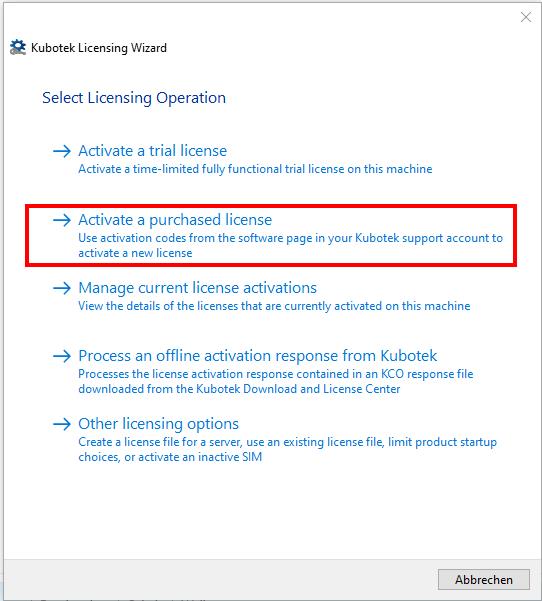Wählen Sie nach dem Start des License Wizard "Activate a purchased license"