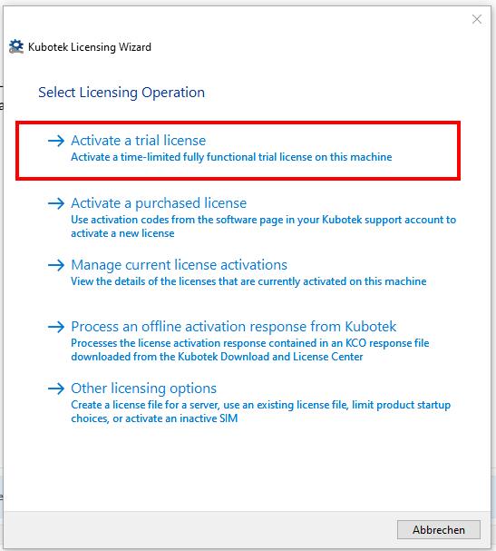 Wählen Sie nach dem Start des License Wizard "Activate a trial license"