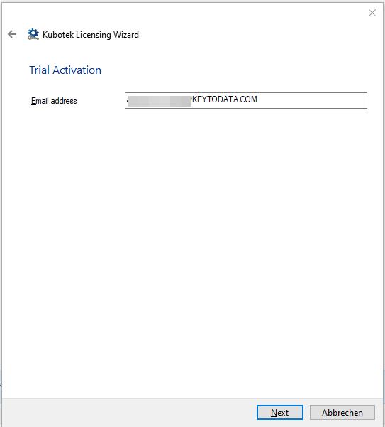 Geben Sie Ihre E-Mailadresse ein und schließen Sie mit Auswahl von "Next" die Erstellung der Testlizenz ab.